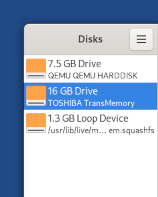 The Disks utility lists all the current storage devices on the left side of the screen.