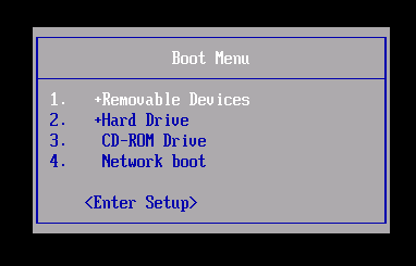 The Boot Menu is a list of possible devices to start from. The following screenshot is an example of a Boot Menu: